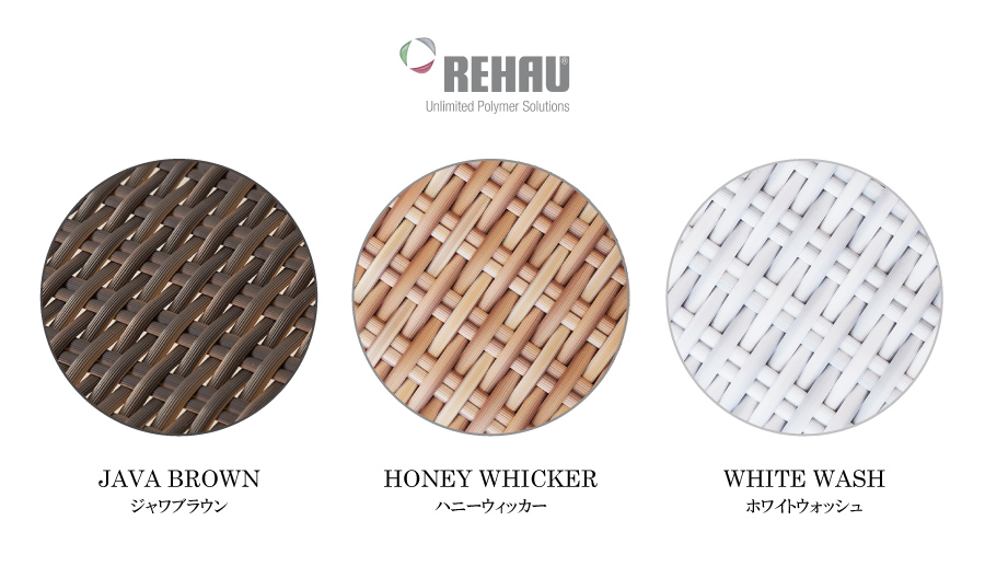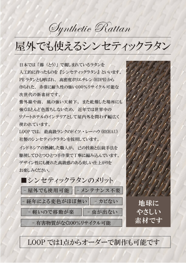 A.シンセティックラタン(人工ラタン)には、さまざまな品質のものが出回っており、安価で販売されているものはポリ塩化ビニール製のものも多く、なかには数年で色褪せしたり、ラタン部分が切れてしまうものもございます。弊社ではドイツの高級樹脂メーカー「レーハウ社」が製造した「ラウコード」という素材を使用しています。非常に耐久性に優れ、弾力性があり自然な風合いと高級感のある仕上がりが特徴的です。長くご使用いただくためにも、安価な製品のご購入には十分ご検討ください。